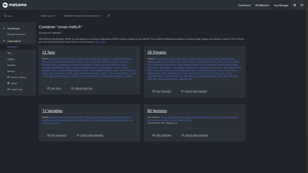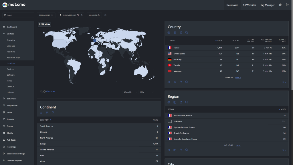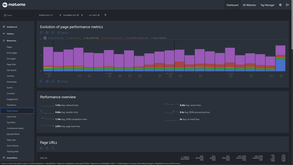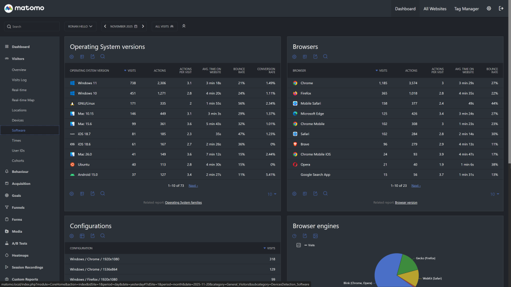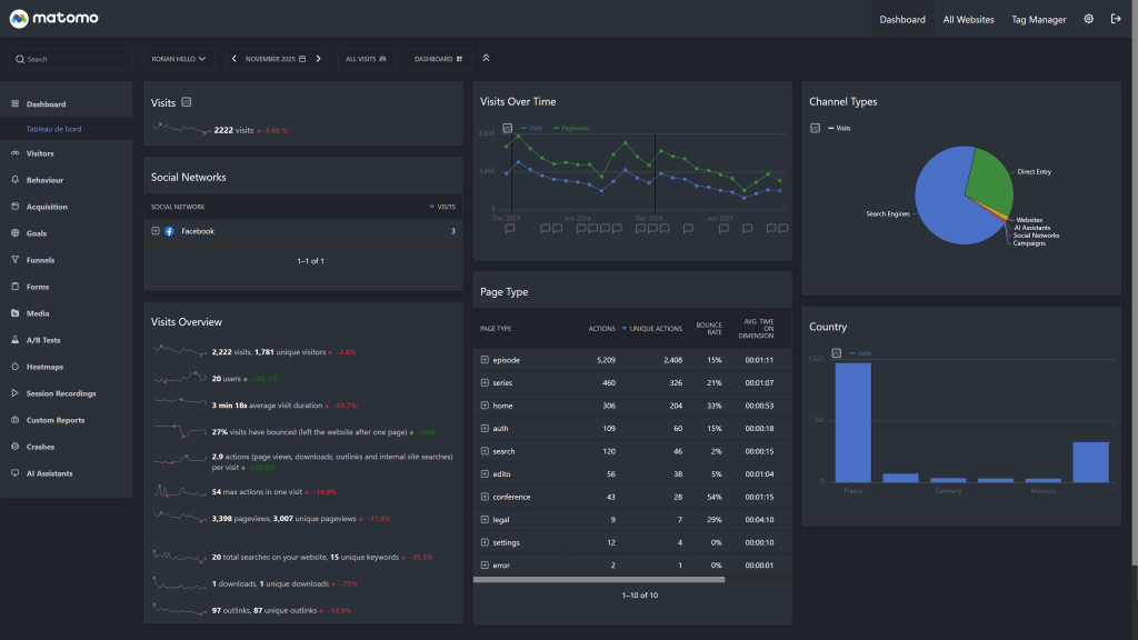 A comprehensive dark theme for Matomo Analytics that transforms the entire interface into a modern, eye-friendly dark experience. Built with accessibility and readability in mind, this theme provides proper contrast ratios and consistent styling across all Matomo features.