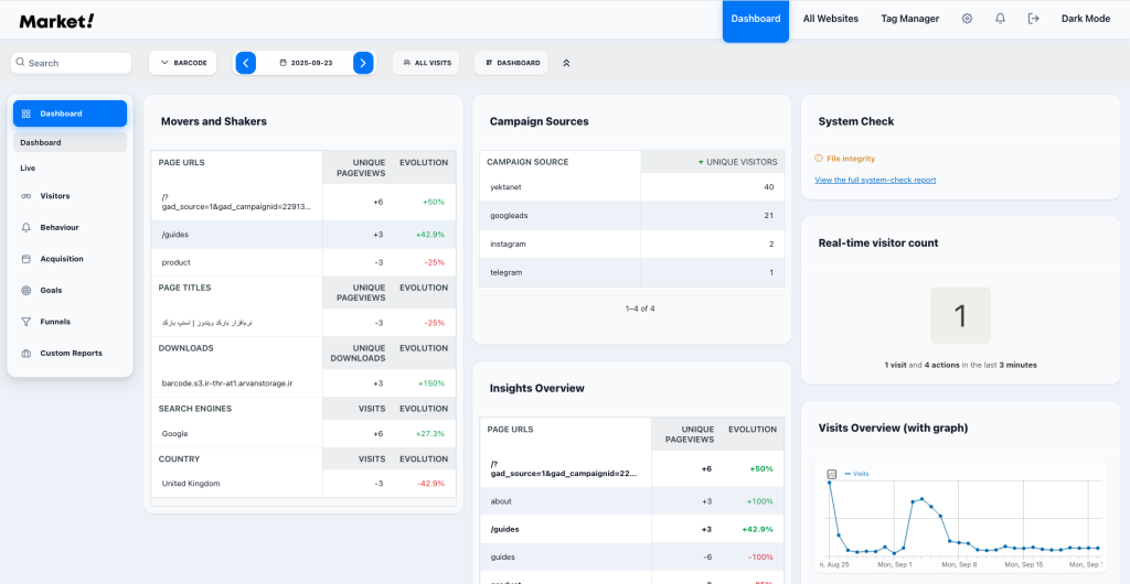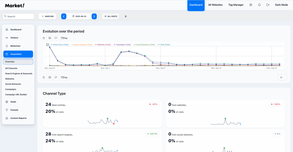A peaceful, modern Matomo theme. Includes a built-in Dark Mode toggle (stores user preference in localStorage).